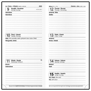 jemně strukturovaný matný materiál, jednostranná výplň desek, ražba roku, rovný hřbet, poutko na propisku v barvě potahu, české a slovenské jmenné kalendárium, dny a měsíce v 5 jazycích (CZ, SK, ANG, D, R), mezinárodní svátky, měsíční fáze, roční období, letní a zimní čas, místo na poznámky, formát 7,5 x 15 cm