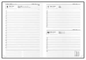 jemný hladký materiál s ražbou po celé ploše diáře, doplněný o gumičku v barvě diáře, poutko na propisku, české a slovenské jmenné kalendárium, mezinárodní svátky, měsíční fáze, roční období, letní a zimní čas, místo na poznámky, daňové termíny, formát 12 x 16,5 cm